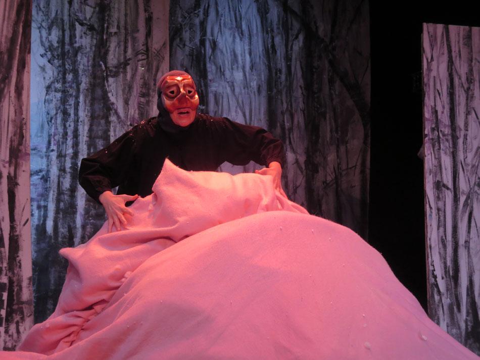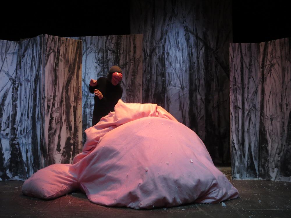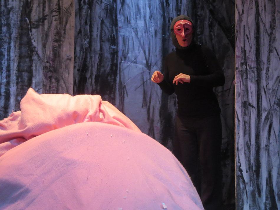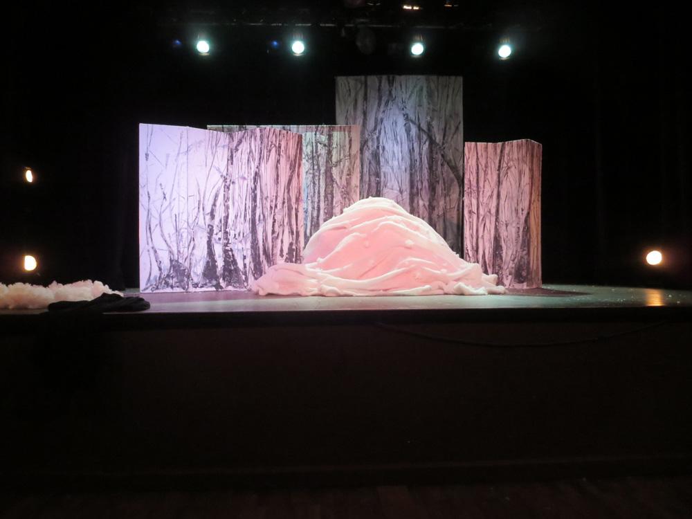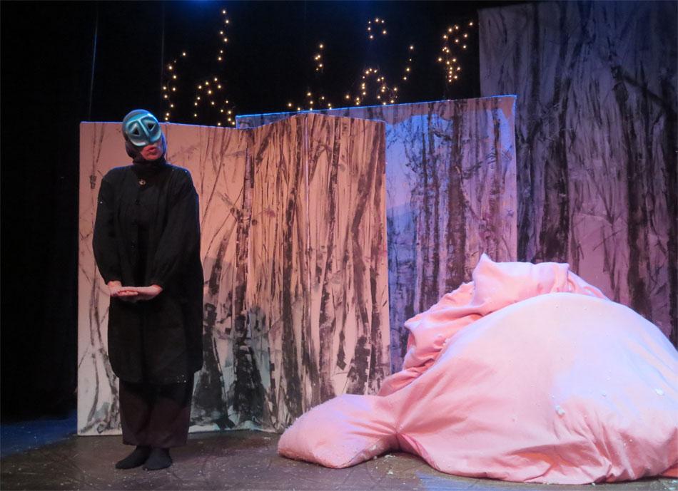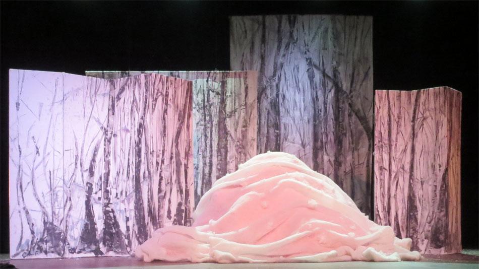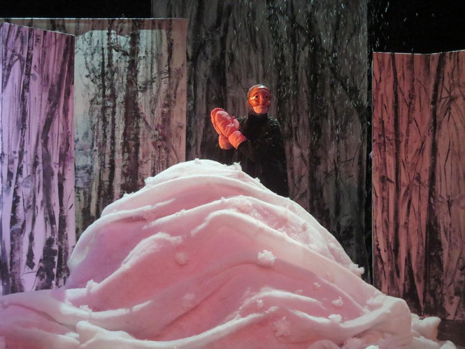 Cette charmante rencontre avec les animaux en hiver, est  mise en scène de façon dynamique et poétique.  Les demi-masques, créés par Tracey Boot, apportent des touches de couleur dans une forêt aux décors épurés, blancs et contemporains, peints par l’artiste Geneviève Joannin.